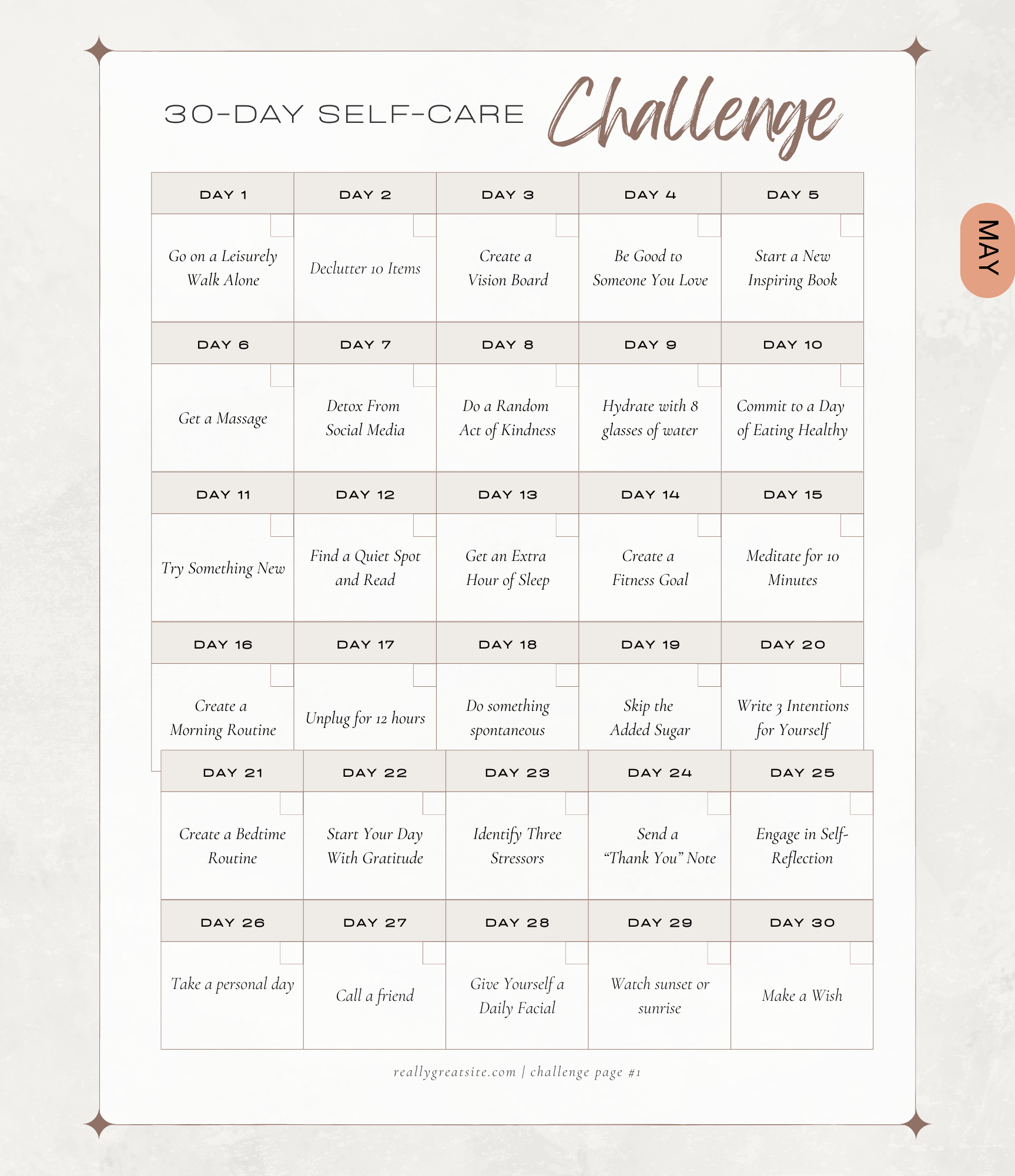 📆 Monthly 30-Day Self-Care Challenges – Fun and flexible themes like: