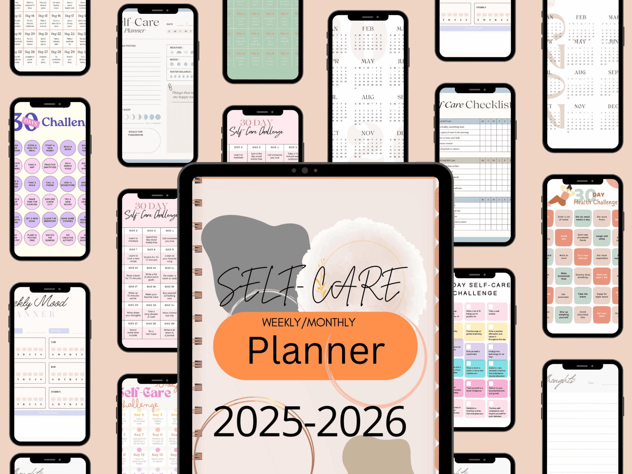Create balance with the Self-Care Planner for Moms. Includes a self-care checklist, planner pages, and monthly 30-day wellness challenges to support your mental health and personal growth.